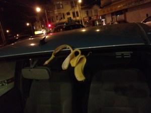 Although it’s not a slipping hazard, this peel should be avoided at all costs. It appears to have crawled up the windshield of a Prius!